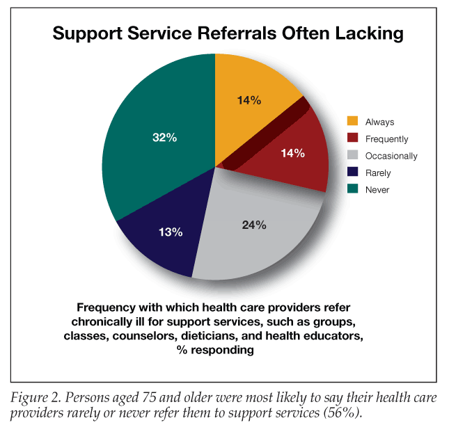 Many with chronic conditions say health care providers could do more to help them. Forty-five percent of respondents say their health care providers rarely (13%) or never (32%) refer them to support services (Figure 2).