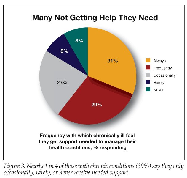 Nearly 4 in 10 persons (39%) with chronic conditions say they only occasionally, rarely, or never get the help and support they need to manage their conditions and improve their health (Figure 3). Those least likely to receive needed support were persons without health insurance (55% responded occasionally, rarely, or never), Latinos (53%), those with annual household incomes of $20,000 or less (50%), and persons who have postponed care in the past year because of cost (49%).