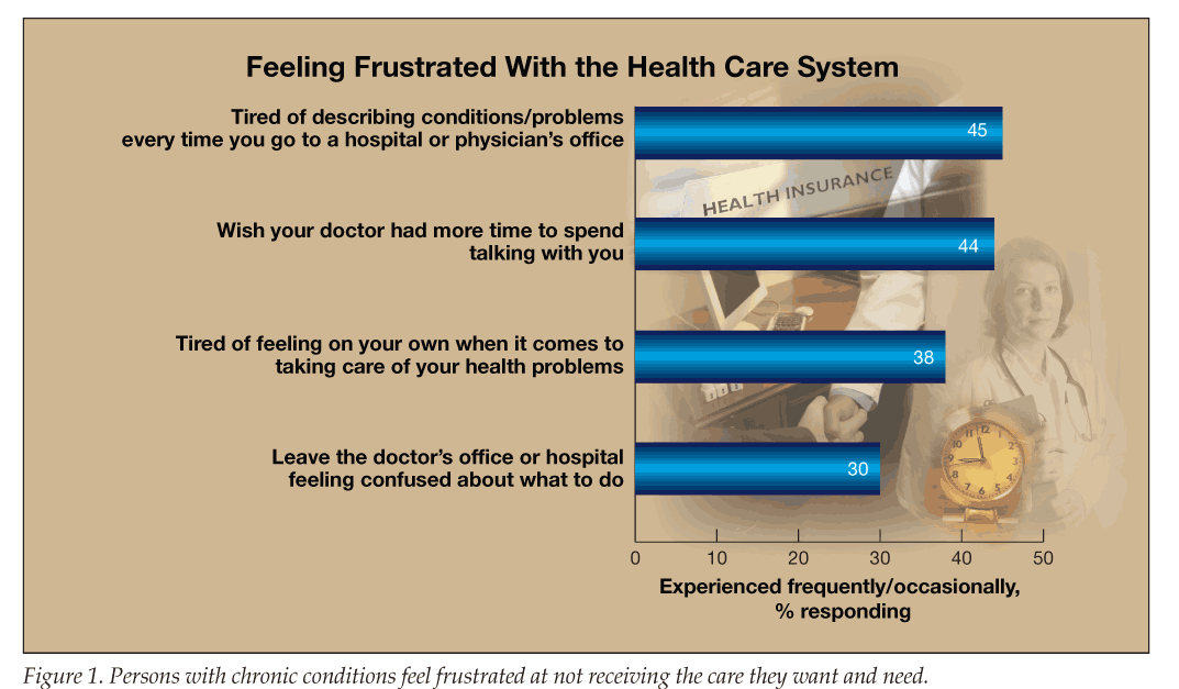However, the health care system is not working well for many with chronic health conditions, according to the report. Forty-five percent of survey respondents with chronic conditions say they are tired of explaining their health problems every time they see a health care provider, and 44% say they frequently or occasionally wish their physician had more time to spend with them (Figure 1).
