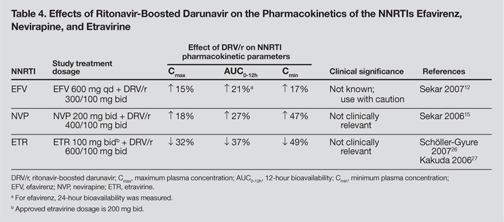 For patients whose antiretroviral history and resistance profile allow treatment with DRV/r plus an NNRTI (in addition to other select agents), the combination may be a highly effective option. Although pharmacokinetic data suggest that dose adjustments are not necessary when DRV/r is given in combination with any of the currently available NNRTIs, understanding pharmacokinetic trends allows clinicians to gauge the potential for adverse effects as well as regimen potency and thus provide the maximum chance for regimen success.