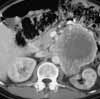 The imaging findings prompt a laboratory evaluation of the adrenals with the following results: urine normetanephrines, 27,787 µg/24 h; total urine metanephrines, 27,861 µg/24 h; urine vanillylmandelic acid, 191.9 mg/24 h; urine norepinephrine,5401 µg/24 h; and total calculated urine catecholamines, 5415 µg/24 h. Levels of urine dopamine and epinephrine are withinnormal limits. A tumor marker workup reveals elevated levels of CA 125 (63 U/mL) and carcinoembryonic antigen (6.4 ng/mL). The radiographic findings and the significant elevation of catecholamines and their metabolites support a diagnosis of pheochromocytoma.