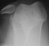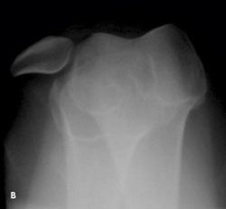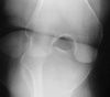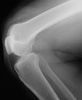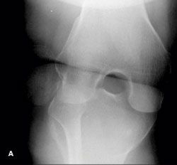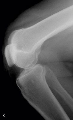 Knee pain following a soccer injury:The frontal radiograph revealsthat the patella is dislocated laterally(A). This is confirmed on the sunriseradiograph (B). A lateral radiographshows the malalignment of the patellawith the distal femur (C). Mostimportant, it also shows no fracture.Lateral dislocation of the patella isdiagnosed.