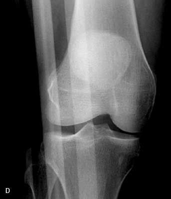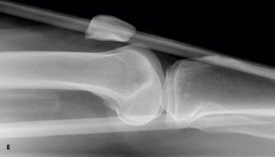 Outcome of this case. The patient'sdislocation was reduced externally.A frontal radiograph of the kneeobtained after the reduction showsnormal alignment of the patella andthe distal femur (D). This is confirmedby a post-reduction lateral view (E).At 3 months, the patient has not hada recurrence.