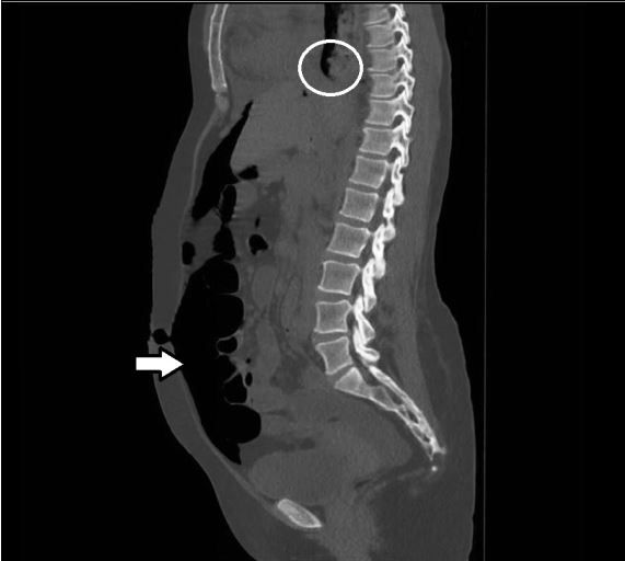 CT scans of the patient’s chest, abdomen, and pelvis further detailed the pneumoperitoneum and showed intraluminal free air alongside gravity-defying intramural air in the small intestine, although there were no signs of perforation (Figure 2). Of note, the radiographs revealed esophageal stricture with proximal dilatation in addition to pneumoperitoneum, consistent with the patient’s diagnosis of scleroderma (Figure 3).