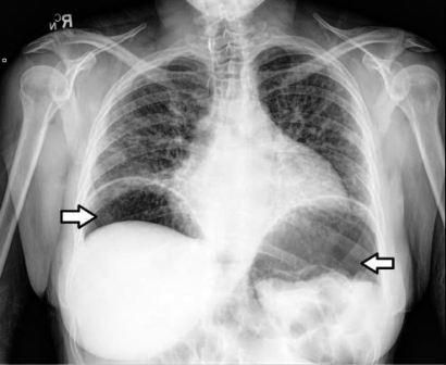 A 53-year-old white woman with schizophrenia was transferred from a psychiatric center after vague complaints of shortness of breath led to obtaining a chest x-ray film, which revealed significant subdiaphragmatic free air (Figure 1). On admission, the patient was alert and oriented; she insisted she was medically healthy and admitted only to mild abdominal distention. She denied current shortness of breath or any other GI complaints and further denied recent fever or chill. Her past history was significant for scleroderma and uncontrolled schizophrenia that resulted from nonadherence to prescribed aripiprazole.