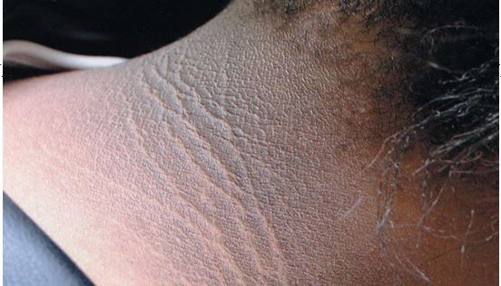 thickening of the skin is often localized to the intertriginous areas such as the back