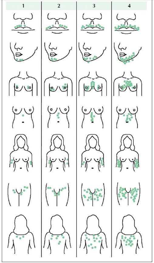Hirsutism may be formally assessed with the Ferriman-Gallwey classification system. Different anatomic sites are graded from minimal hirsutism to frank virilization; a total score of 8 or greater is abnormal. (Reprinted with permission from Moncada E.