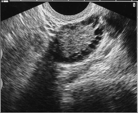A transvaginal ultrasonogram of an ovary of a patient with polycystic ovary