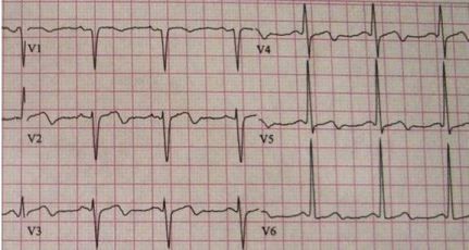 Below are the precordial lead tracings of her electrocardiogram (ECG) taken while she is pain-free in your office. You have no old ECG available for comparison. Labs, including a complete blood cell count, metabolic panel, and cardiac enzymes, are all normal, except for a glucose level of 132 mg/dL.