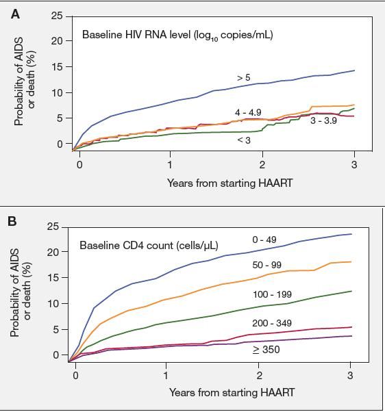 Figure - Kaplan-Meier curves of the probability of progression to AIDS or death based on baselineHIV RNA level (A) and baseline CD4+ cell count (B). (Reproduced with permission fromEgger M et al. Lancet. 2002.8)