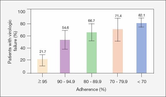 The level of patient adherence to antiretroviral therapy is associated significantlywith virological failure (defined as HIV RNA level of more than 400 copies/mL) (P < .001). Attainingan adherence level of 95% or more was associated with the lowest incidence of treatmentfailure. (Reproduced with permission from Paterson DL et al. Ann Intern Med. 2000.37)