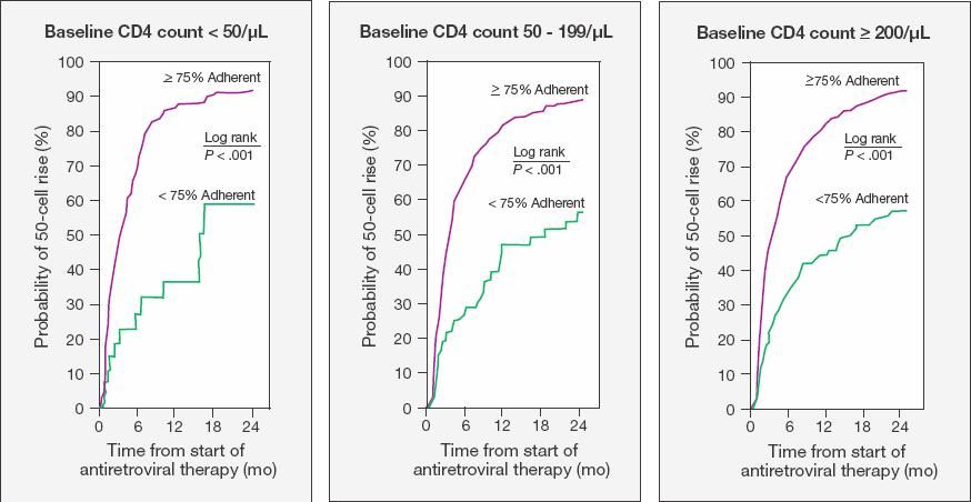 Wood and colleagues13 observed 1522 antiretroviral-naive patients for five 15-week periods to determine the effect of adherence on immune reconstitution. In those starting antiretroviral therapy with a baseline CD4+ T-cell count of less than 200/?L, adherence was the strongest independent predictor of the time to a CD4+ T-cell count of more than 200/?L (HR, 4.85; 95% CI, 3.15 to 7.47). These gains were greatest in patients who were more than 95% adherent, whereas those who were less than 75% adherent did not demonstrate similarly conserved CD4+ T-cell count responses (P < .001).13 As shown in Figure 2, these gains were seen in all patients who were more than 75% adherent, regardless of baseline CD4+ T-cell count.