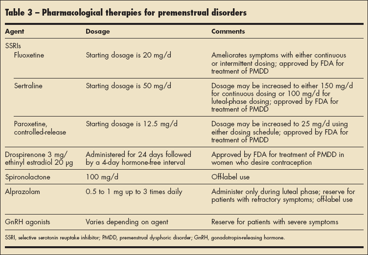 Pharmacological treatment. Drugs that have been approved by the FDA for the treatment of premenstrual disorders include selective serotonin reuptake inhibitors (SSRIs) and a novel oral contraceptive. In addition, several other medications have been used off-label with varying degrees of success in women with premenstrual disorders.