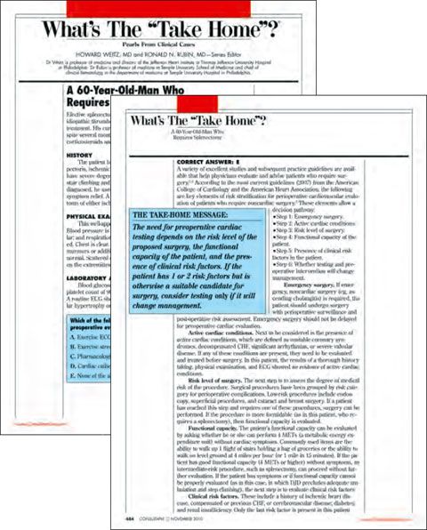 "What's The 'Take Home'?"- which presents the relevant details about a specific clinical case and then challenges you to choose the most appropriate "next step" in diagnosis or treatment-has been a popular feature since it first appeared in these pages in 1998. The cases are carefully selected so that each has an important teaching point, or "take-home" message. In addition to the in-depth discussion of the rationale for the correct answer, this "take-home" message is succinctly summarized and boxed for maximum visibility.