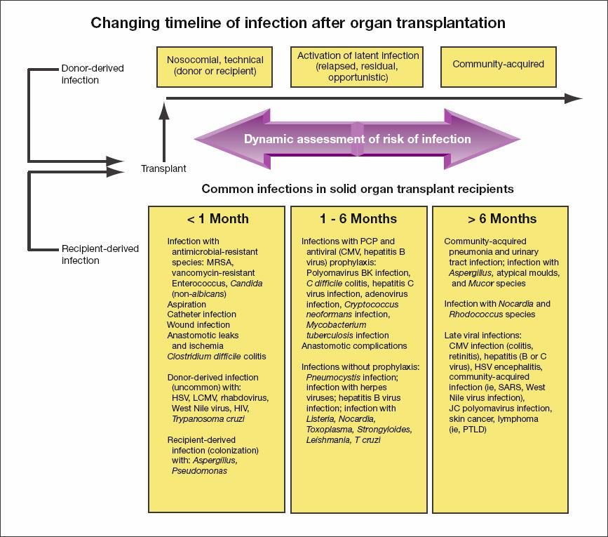 Infections occur in a generally predictable pattern after solid organ transplant. The development of infection is delayed by prophylaxisand accelerated by intensified immunosuppression, drug-related toxicities that may cause leukopenia, or immunomodulatory viral infections suchas those caused by CMV, hepatitis C virus, or Epstein-Barr virus. At the time of transplant, a patient's short-term and long-term risk of infectioncan be stratified according to donor and recipient screening, the technical outcome of surgery, and the intensity of immunosuppression requiredto prevent allograft rejection. Subsequently, an ongoing assessment of the risk of infection is used to adjust both prophylaxis and immunosuppressivetherapy. (MRSA, methicillin-resistant Staphylococcus aureus; HSV, herpes simplex virus; LCMV, lymphocytic choriomeningitis virus;PCP, Pneumocystis pneumonia; CMV, Cytomegalovirus; SARS, severe acute respiratory syndrome; PTLD, posttransplant lymphoproliferativedisease.) (Adapted from Fishman JA. N Engl J Med. 2007.37 Used with permission.)