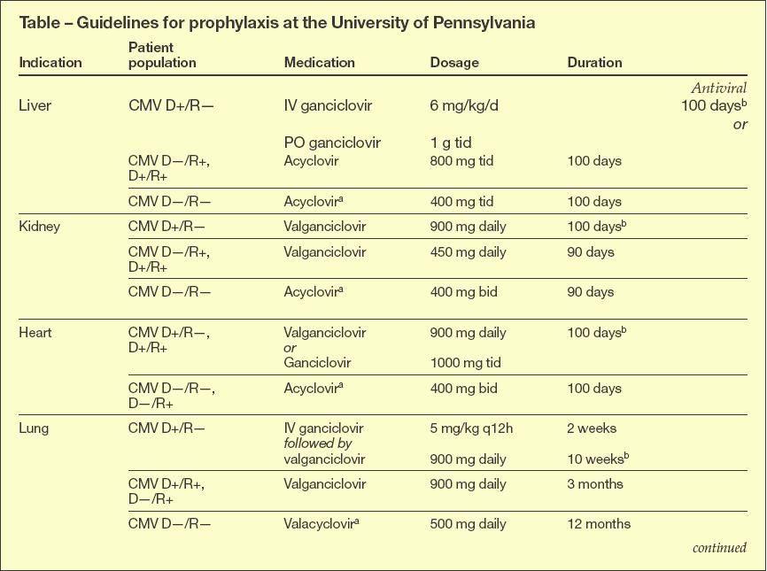 Each strategy has advantages and disadvantages. Prophylactic therapy may be logistically simpler to follow, particularly outside the clinical trial environment. However, universal prophylaxis carries a potential risk of development of ganciclovir-resistant CMV.5 It also may prevent antibody formation and may delay the presentation of CMV infection. In addition, antiviral therapies may not be well tolerated; adverse effects include significant cytopenias. Preemptive therapy carries less risk of drug-related toxicities, but it leads to higher rates of asymptomatic CMV infection. Potentially, more virusmediated modulation of the immune system could occur.