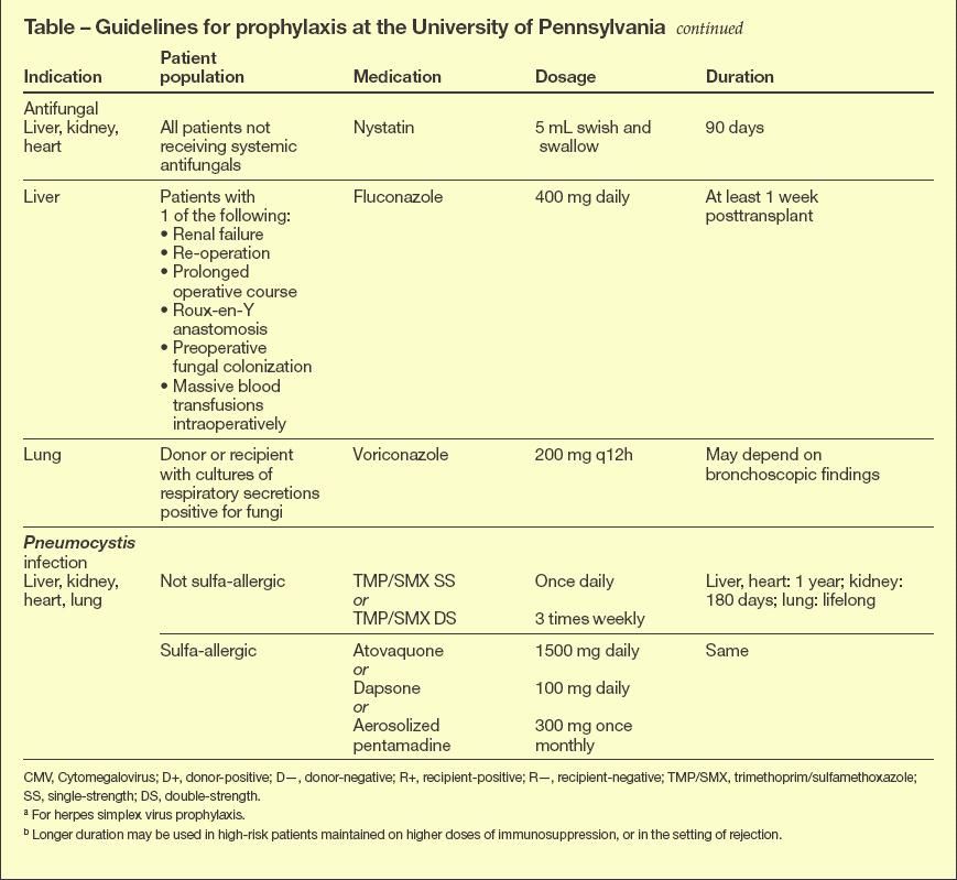 Before trimethoprim/sulfamethoxazole (TMP/SMX) was routinely used in the SOT recipient, there was a high incidence of Pneumocystis pneumonia (PCP) posttransplant, especially between months 2 and 6 following transplant. The risk of PCP in the SOT recipient is also increased during periods of prolonged neutropenia and increased immunosuppression. It has been suggested that prophylaxis with TMP/SMX be limited to centers in which the incidence of PCP is greater than 3% to 5% or to any patient previously infected with Pneumocystis.26 In practice, most centers continue to provide prophylaxis for all SOT recipients for at least a limited time after transplant.