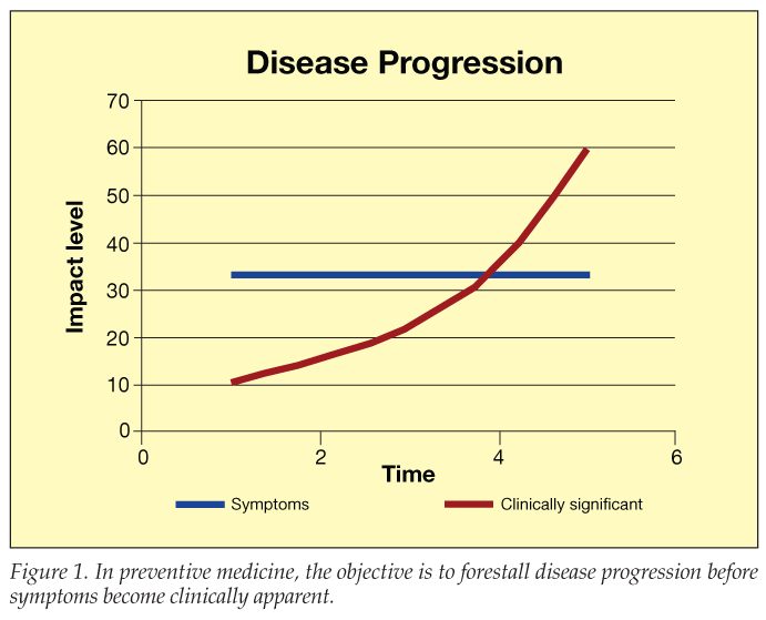 tracks the progress of a typical disease. The “symptoms” line shows the impact of the disease increasing over time. The line labeled “clinically significant” indicates the level at which symptoms become apparent to the patient. At the point where these two lines intersect, the patient visits his or her physician and treatment begins. The preventive approach focuses on intercepting the disease before it reaches a clinically significant level.