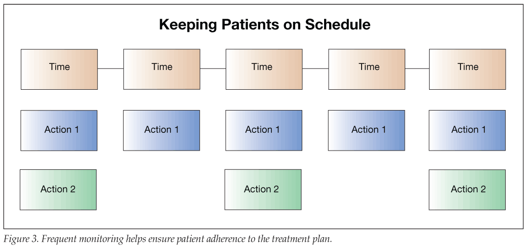 shows the treatment plan with a time line and with various actions performed at defined intervals. Each action represents a visit to a physician’s office, taking a pill, or obtaining a diagnostic test. Frequent monitoring of and interaction with the patient on the treatment plan improve outcomes while the providers’ revenues are also increased because visits are not missed, prescriptions are refilled on schedule, and proper follow-up is maintained. Pharmacists who implement a consistent plan of adherence monitoring can not only improve overall health of the population but also benefit by ensuring that refills are filled and that patients are reminded to adhere to the treatment.