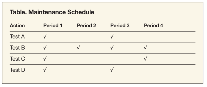 A sample maintenance schedule is shown in the Table. All activities are scheduled. Test A is performed every first and third period while test B is performed every period. Test C is performed every first and fourth period and test D is performed every first and third period.