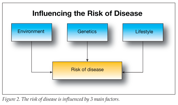 The risk of disease is affected by a combination of elements. The elements are typically grouped under environment, lifestyle, and genetics (Figure 2). Minimizing the risk of disease requires that the preventive medicine be both personal and risk-based.