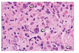Figure 2. High-power magnification demonstrates large Reed-Sternberg cells (arrows) with a background of reactive cells (hematoxylin-eosin stain, original magnification ×1000).