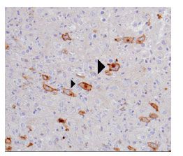Figure 3.The Reed-Sternberg cells express CD30 (arrows) (CD30 immunostain, original magnification ×1000).