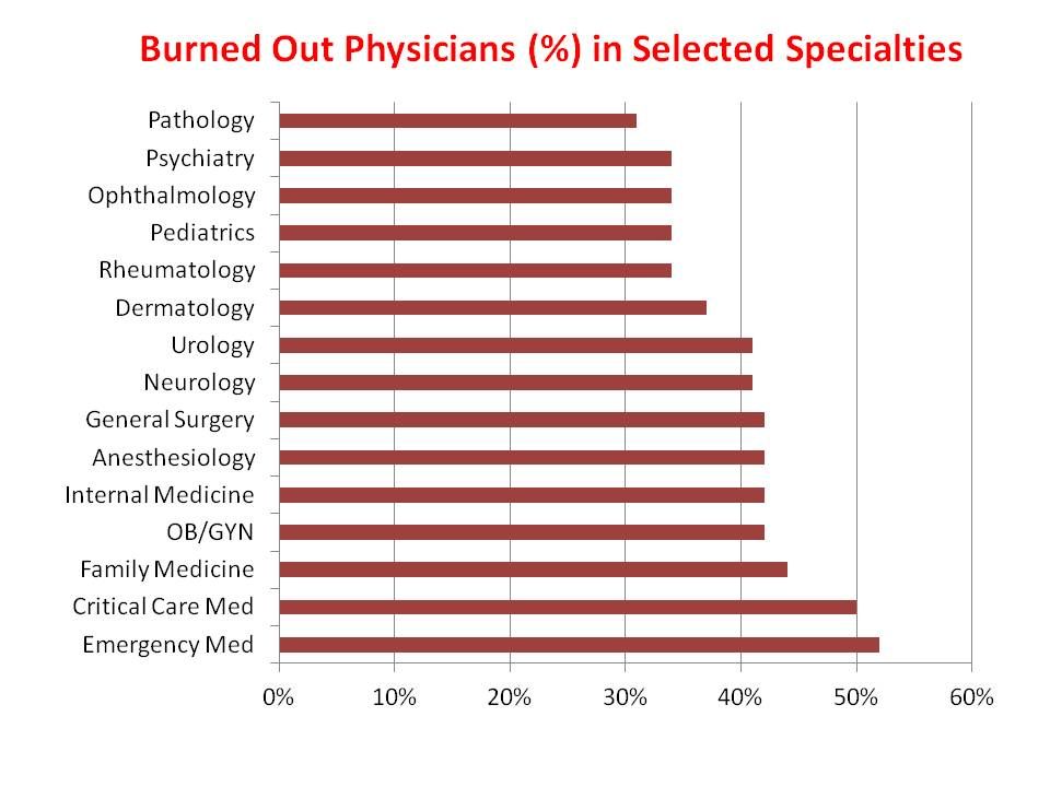 That survey shows that roughly 1 of 4 doctors across various specialties are dealing with at least 1 symptom of burnout-a loss of enthusiasm for work, a sense of cynicism, and/or feelings of inadequate personal accomplishment. Rates of burnout and its level of severity vary across clinical specialties.