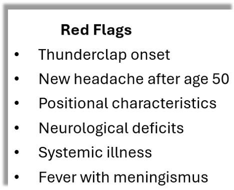 Most chronic recurring headaches are migraine, Levin said, but vigilance for secondary causes is essential, especially in the presence of "red flags," (below). Levin cautioned, clinicians should be vigilant for secondary causes. For thunderclap headaches specifically, ie, severe and sudden in onset, reaching peak intensity within seconds, he described a systematic approach to assessment, beginning with noncontrast CT imaging. If findings are negative, move on to lumbar puncture for xanthochromia. If results are nondiagnostic, Levin said vascular imaging is indicated (CTA, MRA, MRV), to evaluate for aneurysm, RCVS, vasculitis, PRES, or venous thrombosis.