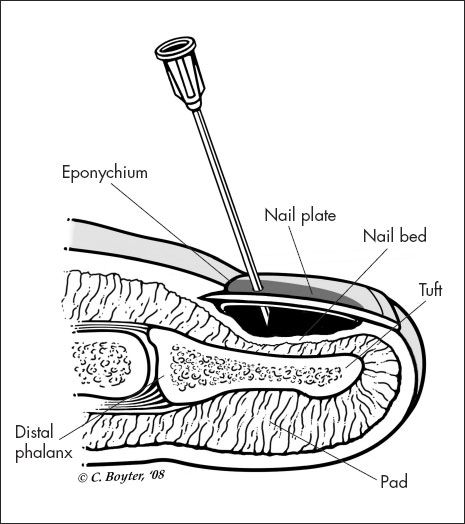Figure 4 – When draining a subungual hematoma with a needle, try to stop just before the needle reaches the sensitive nail bed.