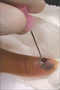 There are a variety of drainage methods. One of the techniques most commonly taught to new practitioners is to employ heat to melt a hole in the nail. A heated paper-clip tip or a portable medical electrocautery unit may be used (Figure 2).3 Some clinicians feel that trephination accomplished through the use of heat is more painful than other methods. There is also a possibility that the heat will cause the blood to coagulate and thus limit drainage. However, I have not found this to be a problem.