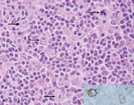 Endoscopic retrograde cholangiopancreatography demonstrated a moderate stricture of the common hepatic duct that extended into the first branches of the intrahepatic ducts. This suggested a possible Bismuth II cholangiocarcinoma (A). A 13-cm 8.5-French plastic stent was placed for decompression. Brushings were negative for malignant cells and tumor markers were also unrevealing. After oncology and surgery consultation, a presumptive diagnosis of cholangiocarcinoma was made. The patient was referred for exploratory laparotomy with the intent of primary resection. Intraoperative choledochoscopy revealed a patent biliary tree with no evidence of cholangiocarcinoma. Instead, an enlarged lymph node on the posterior-medial aspect of the liver was discovered compressing the hilum and causing obstruction. Excisional biopsy results revealed lymphocyte-rich Hodgkin lymphoma (B). A biopsy of concomitant mesenteric lymphadenopathy confirmed the diagnosis.