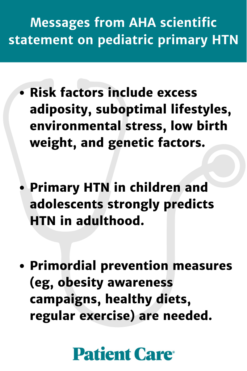 Reference: Falkner B, Gidding SS, Brady TM, et al. Pediatric primary hypertension: An underrecognized condition: A scientific statement from the American Heart Association. Hypertension. Published online March 30, 2023. doi:10.1161/HYP.0000000000000228.
