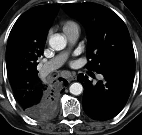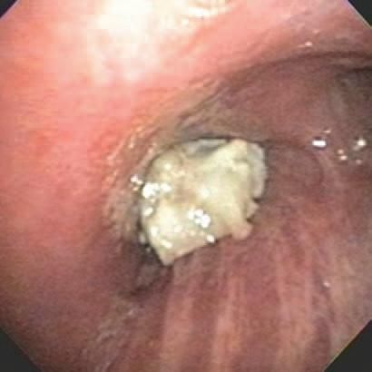 The initial physical examination showed the following: heart rate, 100 beats per minute; blood pressure, 108/65 mm Hg; oxygen saturation, 94% on room air (measured by pulse oximetry); and normal temperature. Chest auscultation revealed diminished breath sounds over the right hemithorax and bilateral expiratory wheeze. The patient's chest radiograph showed a right lower lobe infiltrate. A CT scan of the chest showed a right sided endobronchial mass and right lower lobe atelectasis (Figure 1). The patient was treated with intravenous piperacillin/tazobactam and inhaled bronchodilators.