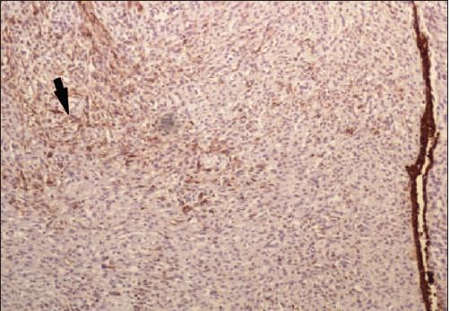 Figure 3 – Spindle cells (arrow) with positive cytokeratin staining can be seen in this histopathological specimen.