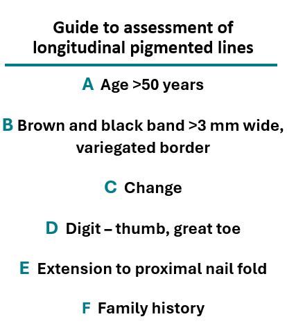 While benign causes are frequent, clinicians must remain vigilant for melanonychia and follow the ABCDEFs longitudinal pigmented lines. "Be particularly careful about the width of the band," the “B” in the mnemonic, Elewski cautioned. “Measure the band; document the width in your notes; document that it is straight, note the color, and take a photo.” If you are concerned, a biopsy is indicated.