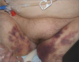 Definitive enlightenment occurred when we made initial contact with the patient's daughter by telephone a few minutes later. She described multiple unsuccessful attempts to place central venous lines via the femoral approach. She had been terribly upset by the disfiguring ecchymoses that resulted, notwithstanding that the only medical complication was bleeding that required transfusion of 1 unit of packed red blood cells. Armed with this knowledge, we made a diagnosis of iatrogenic hematomas from attempted placement of a triple lumen catheter in each femoral vein. We also marveled that the punctures had healed to the point of invisibility in just 7 days, even though the patient had been nutritionally compromised, febrile, and critically ill for most of that time.