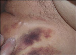 We considered the possibility of iatrogenic puncture lesions, despite the absence of any such mention in the medical records available to us. However, a careful search revealed no puncture wound, whether fresh or healing (Figure 1); this seemed to exclude vascular catheterization or femoral venipuncture.