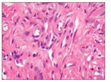 In January 2007, the patient’s CD4+ cell count dropped to 164/µL (7%), but his HIV RNA level remained below 50 copies/mL. His fasting serum insulin level was 7.9 µIU/mL (normal, less than 23). At baseline, cortisol levels were less than 0.4 µg/dL (normal at 8 am, 6.0 to 28.0) and adrenocorticotropin levels were less than 5 pg/mL (normal, 7 to 50). These results were consistent with adrenal insufficiency. He underwent multiple biopsies of the papules, and histopathological results confirmed KS (Figure).