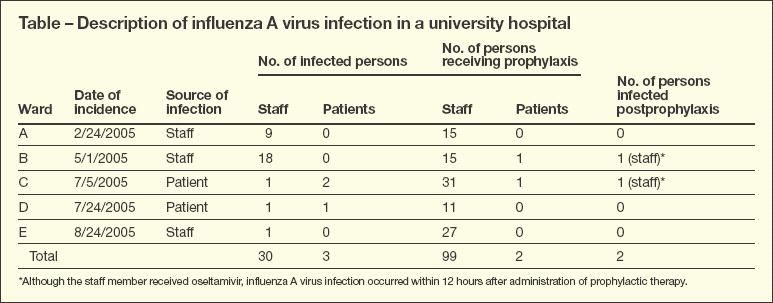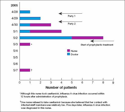 Influenza can be transmitted between patients and medical staff in a hospital setting, resulting in increased morbidity and mortality, especially in immunocompromised patients.1,2 The World Health Organization and the CDC recommend vaccination for medical staff, with particular emphasis on persons who care for members of high-risk groups.3,4 However, even though the staff has been vaccinated against influenza, it is impossible to prevent all nosocomial influenza virus infections. We describe the usefulness of prophylactic administration of oseltamivir to prevent nosocomial influenza virus infection during an outbreak in the community at large.