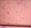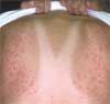 This 21-year-old college student was recently hospitalized for an asthma exacerbation, which responded to inpatient treatment. However, about 1 week after she was discharged, a mild asymptomatic rash developed on her face and to a greater extent on the upper trunk. She uses a nonsteroidal inhaled bronchodilator, a nonsedating antihistamine, and a leukotriene inhibitor that was continued from before her hospitalization.