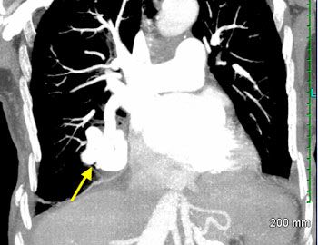 A CT scan of the chest with contrast revealed a right infrahilar large (4 cm) pulmonary arteriovenous malformation (PAVM) (Figure). A contrast echocardiogram (TTE with bubble study) revealed significant delay before bubbles appeared in the left atrium-a finding that confirmed the intrapulmonary shunt. The patient was transferred to another facility for embolization therapy.