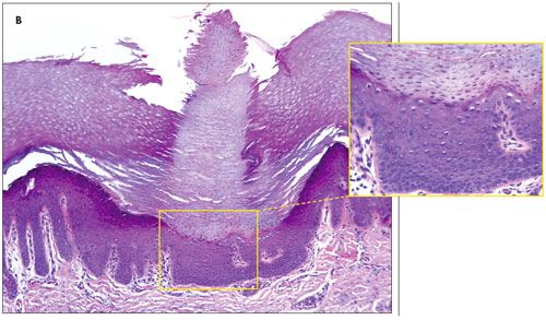 Biopsy specimens of the papules revealed a spire of hyperkeratosis, parakeratosis, and hypogranulosis overlying an epidermal depression and the absence of dyskeratosis or atypia (B, hematoxylin-eosin magnification ×100 ). These findings are consistent with keratosis punctata.
