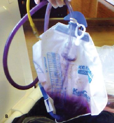 Following the transfer of an 82-year-old man with end-stage dementia to an inpatient hospice, his urinary catheter and bag displayed purple staining (B). Investigation was refused because of the family’s request for strictly palliative care.