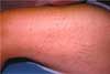 Case 3: The patient has follicular eczema, D, an eruption of folliculocentric accentuated (ie, palpable) papules that is provoked by bathing habits (such as bathing more than once a day or frequent swimming); environment (such as using a loofah); or shaving habits (such as using a triple-edged razor). Treatment measures include avoidance of the initiating factor and use of a topical corticosteroid cream.