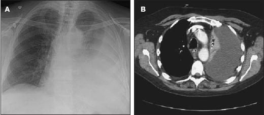 Figure 3 – A large left-sided effusion with left lung collapse was found on a second chest radiograph (A) and a CT scan of the chest (B).