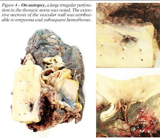 An autopsy confirmed the diagnosis of an organized left-sided empyema, adherent to the aorta and left lower lobe of the lung. A large irregular perforation in the thoracic aorta was noted, with extensive necrosis of the vascular wall attributable to the empyema with subsequent hemothorax (Figure 4). The chest tube was in place, and both the tip of the tube and the incision site were not near the aorta. No evidence of pneumonia or malignancy in the chest was noted.