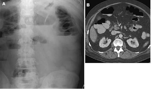 Figure 1 – An intestinal obstruction series (A) and a CT scan of the abdomen (B) showed an ileus but no obstructing mass.