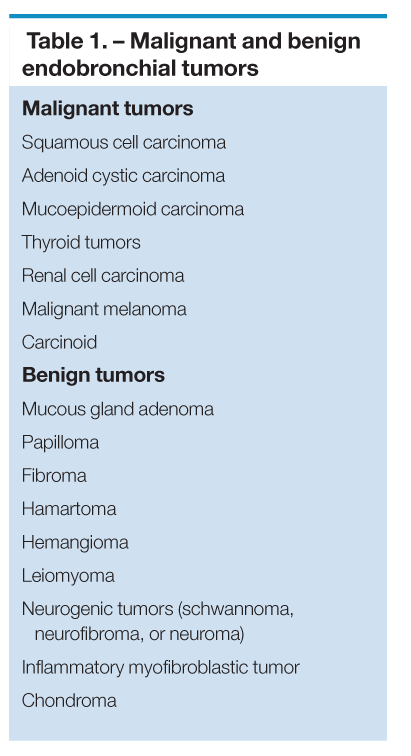 Endobronchial tumors can be either malignant or benign (Table 1).1-3 Neurogenic tumors are rare and can manifest at any age (with most occurring in young adulthood, after age 20 years).2 This type of tumor arises from peripheral nerves located within the bronchial wall, composed of nerve sheath Schwann cells, described as neurilemomas (schwannomas) or neurofibromas.4 Endobronchial schwannomas are extremely rare; the exact incidence is not known, although one institution reported that 0.2% of all lung tumors were primary neurogenic tumors.5,6
