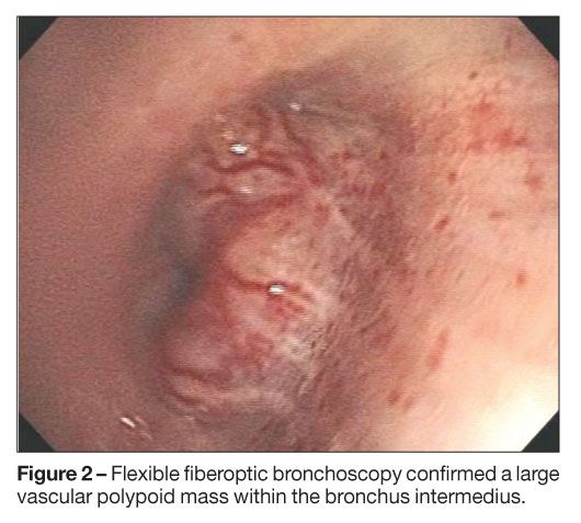 The initial chest radiographic findings suggested a possible superior segment, right lower lobe mass. A CT scan of the chest showed a 1-cm irregular lobulated mass in the bronchus intermedius without evidence of lymphadenopathy (Figure 1). Flexible fiberoptic bronchoscopy confirmed a large vascular polypoid mass within the bronchus intermedius (Figure 2). The bronchoscope was passed around the mass and beyond it into the distal airways, which appeared normal. Cytobrush and endobronchial biopsy specimens were taken. A small amount of bleeding occurred during the biopsy and stopped after application of topical phenylephrine (0.8 mg total).
